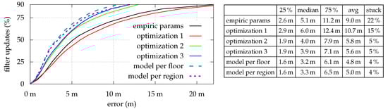 Cumulative error distribution for each model when used within the final localization system from Equation (1). The error between ground truth and estimation is calculated for each filter update, every 500 ms. Especially optimization 1 suffered from over-adaption and thus provided worse results. Compared to just using Wi-Fi (Figure 8) the error difference between the models now is much more distinct. Starting from optimization 2 the system rarely gets stuck and provides a viable accuracy.