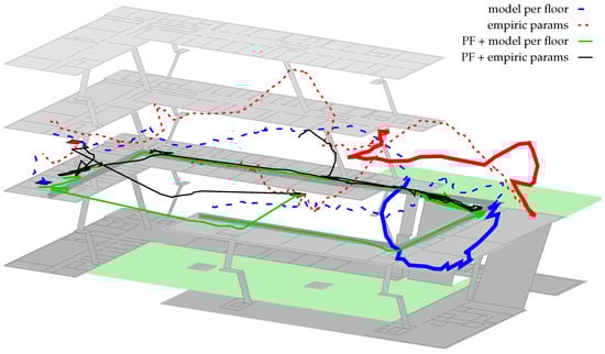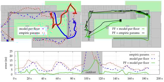 Detailed analysis of the Wi-Fi error for empiric params (unoptimized) and model per floor using Path 1 (see Figure 7). While optimization reduces the error indoors, the error outdoors is increased (bold line). A particle filter (PF, Equation (1)) on top of the optimized model takes 5 s to initialize the starting-position (rectangles), fixes the outdoor-issue and improves indoor situations. A filter on top of empiric params got stuck right before entering the second building. Both, the filtered and unfiltered version of empiric params are dragged into the second floor in the middle of the walk. As the particle filter starts uniformly distributed along the whole area, the initial estimations determine the pedestrian’s position to be in the center of the area (average position among all particles). The black and green walks thus start in empty space above the ground. After a few filter updates (see first seconds of the error plot) the estimation represents the pedestrian’s actual position within the building.