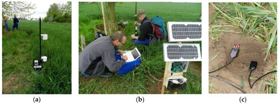 Sensor installations in various conditions: (a) field sensors in a field with winter wheat; (b) installation of a WSN gateway; (c) detailed installation of soil moisture sensors in the soil profile.