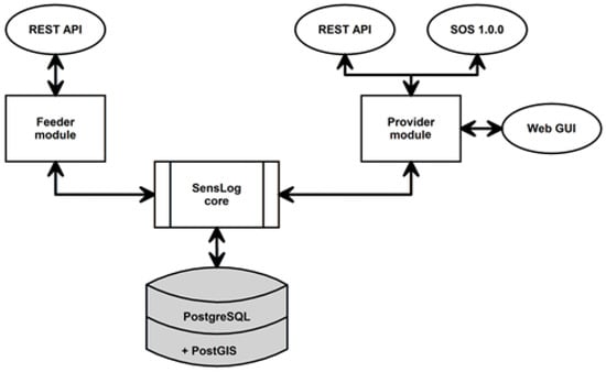 As shown in Figure 3, communication between sensors and SensLog is possible through two interfaces, SOS 1.0.0 and/or REST API. The provider module controls communication between the two defined interfaces and (SensLog) core of the application, i.e., by modifications of the periodicity of sensor measurements, battery status, or measured features. The web GUI (Graphical User Interface) was developed for the user-friendly control of available sensors and their modifications. The SensLog core enables the business logic of the SensLog application, i.e., it can receive sensor data, store them in a database, or provide aggregated measurements or statistics derived from measured data to a user through the Feeder module and the REST API. SensLog is an open and extensible application; for instance, MapLogAgri is one of its specific extensions.