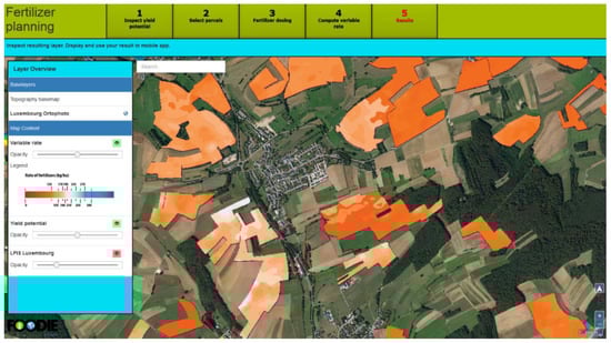 The evaluated farm lies in the Czech Republic and its acreage is about 1284 hectares. The transferability of the potential yield concept was, among others, verified for the country of Luxembourg. A simple application depicting potential yield from satellite images and re-computing the appropriate amount of fertilizer may be found under the URL http://foodie-data.wirelessinfo.cz/php/foodie_luc/ (see Figure 4). The aim of this application is to minimize the amount of fertilizer inserted into the ground and therefore to provide a basis for the prevention and/or reduction of disaster risk in cases of water pollution [45]. The developed application is an open one, i.e., available to all users.