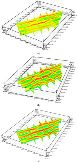 The experiments undertaken in this study show that the triangular prism quadric interpolation algorithm is more than comparable to kriging and IDW [26,37,38], and is actually superior. The spline elements of the 15 nodes on the triangular prism show a high accuracy and stability and are insensitive to mesh distortion. In terms of its application, it reflects both overall trends and local change in a property field, achieving smoothness when reaching an adjacent body. In addition, the triangular prism quadric interpolation algorithm also has directivity, expressing properties along both the horizontal and vertical layers. Some other interpolation algorithms, such as the 13-node pyramid element and the 21-node hexahedral element, have been successfully applied in elasticity mechanics [21]. The linear triangular prism interpolation algorithm does not perform as well as the interpolation algorithm tested; however, it is easy to use, has a high efficiency, and expresses local changes in properties. Kriging is a traditional low-pass filter interpolation algorithm [26], and expresses a property better than the linear triangular prism overall; however, this approach cannot reflect local information found in the original data. IDW interpolation has a “cluster” effect with no directivity; therefore, it gives the least satisfying results.