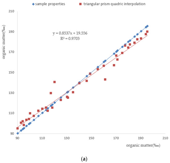 Cross-validation can determine the accuracy and stability of a model. All known property points were divided into a training set and testing set with the cross-validation method for prediction, using the interpolation methods discussed in previous sections. The precision of the interpolation algorithms was compared using the correlation coefficient (R2) of the new interpolation values to the sample values. As shown in Figure 14a–d, for 37 sampling points, the quadric triangular prism interpolation (R2 = 0.9703) is nearest the actual value and the points in a scatter plot are concentrated nearest the zero-error line, reflecting an unbiased valuation. The linear triangular prism interpolation (R2 = 0.8443) is followed by kriging (R2 = 0.8457), and the IDW method (R2 = 0.8078) is last.