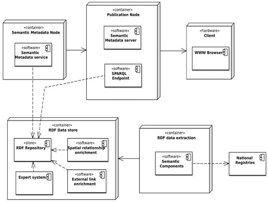 The basic concept of the system derived from system assumptions is shown in Figure 1. It was further developed into the system architecture, with consideration of specific technical approaches and solutions. The components of the system are shown in Figure 2. Both spatial and non-spatial data are integrated and converted into a RDF model with the use of Semantic Components software, which opens the possibility of converting spatial data sources, in this case data from National Registries, into RDF representation according to commonly used spatial ontologies. Data in the RDF model is enriched with the result of spatial analysis, performed with the use of custom SPARQL extensions, such as distance to strategic points, neighborhood analysis, insolation analysis, and so on. The data is enriched with links to other RDF resources, such as Geonames, DBpedia, as well as with dereferenced links to the geoportals on which the resource can be found, which metadata was also converted into RDF for the purpose of linking. These operations are performed in spatial relationship and external links enrichment modules, which is strictly connected to a RDF repository and extends SPARQL engine capabilities with additional properties and SPARQL filter properties which can be used in SPARQL queries. Spatial enrichment (linking spatial data) is performed by executing prepared SPARQL UPDATE query sets, with results recorded into a distinct subgraph.