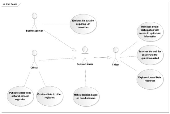 Linked Open Data is generally available as “raw” RDF datasets, transformed directly from registry databases with no particular application in mind. Publishing such information with HTML + RDFa is often designed for specified actors, such as citizens, businesspersons, or administration officials to answer a specific question which will use the system in different way. This approach requires the LOD resources to be semantically enriched and prepared to fit the requirements. The main idea of the approach that is presented is to implement semantic enrichment as a means of providing links not only to external resources in a LOD manner (cadastral parcels linked to specific zoning plan) and links to other spatially connected resources (parcel linked to neighbor parcels or road nearby) but also to provide direct answers for questions frequently asked by a specific actor, such as time of arrival to the city center, distance to the nearest parks or if the parcel is available to buy. Use cases of the system specified for various actors are shown in Figure 3.