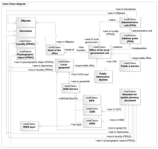 A class diagram presenting the main relationships between the published resources is shown in Figure 4. The links to the National Register of Geographical Names and Geonames was created based on spatial analysis. Objects from these resources, that are located in the area of the described resource are indicated and linked using properties: “seeInLocality(PRNG)”, “seeInPhysiographicObjects (PRNG)” and “seeInGeonames” properties. The links to the DBpedia are created based on lexical and semantic analysis, using the appropriate SPARQL query. They are represented as “seeInDBpedia” property. The connections to the Public Information Bulletin are based on lexical analysis and the URL (Uniform Resource Locator) pattern for this type of resource by substituting the part of the pattern with the proper element. The property “hasURL” derived from the vCard ontology [] was used to represent this relationship.