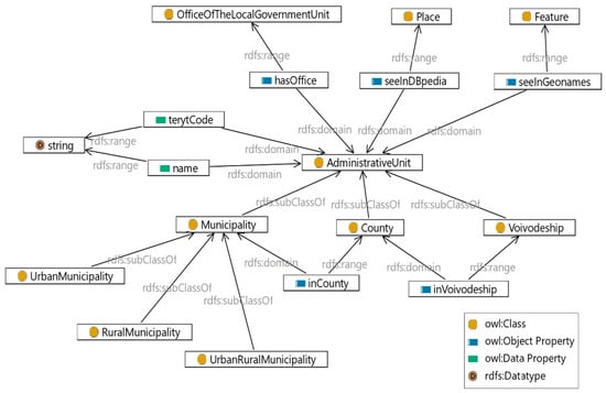 For the purpose of data publication and extracting the knowledge from it, domain ontologies have been developed, that use other existing domain ontologies, such as vCard, Org [], FOAF [], GeoSPARQL [], Basic Geo (WGS84 lat/lon) [] or Dublin Core [] to ensure interoperability and also define specific classes and properties. The ontologies have been created using an open source software, Protégé Desktop v. 5.2.0 and are represented in OWL 2 DL (Web Ontology Language). They contain the following main classes: administrative unit, address point, office of the local government unit (as subclass of FormalOrganization from Org ontology), head of the local government unit (as subclass of Person from FOAF ontology), metadata for the local geoportal, metadata for spatial planning documents, and public e-service. The relationships between classes are defined, so that it is possible to perform interference. Part of the ontology for the National Register of Boundaries is shown in Figure 5.