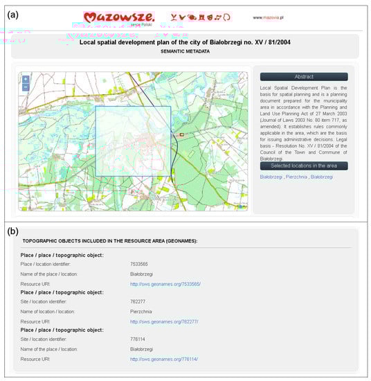 Fragments of HTML document, containing metadata for local spatial development plan: (a) title, basic information and bounding box of data; (b) links to Geonames features, included in the resource area.