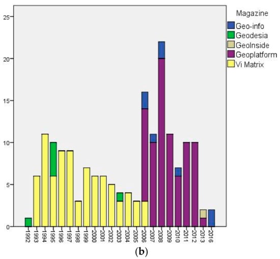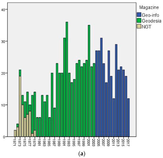 Articles concerning the Dutch large-scale base map (BGT) were found by searching for keywords such as ‘GBKN’ (Grootschalige BasisKaart Nederland), ‘BGT’, ‘Grootschalige BasisKaart’ and ‘GBK’. These represent either the name or abbreviation of the current large-scale base map or its predecessors. All articles containing these keywords were selected; only advertisements were ignored. In a similar fashion, articles related to the Flemish large-scale reference map (GRB) were selected by searching for the keywords ‘GRB’ or ‘Cardib’. Because these articles were selected manually, the magazines were double-checked. In total, 877 articles were selected covering the history of the BGT and 176 covering the history of the GRB. Figure 1a,b show the distribution of the articles over time.