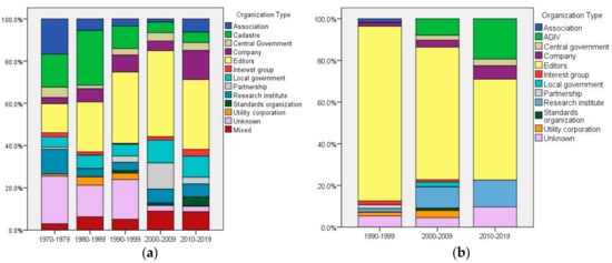 First, the articles were analysed at the meta level. For all articles, the title, publication date, page numbers, article type, authors and author organisations were noted. The author organisations were further aggregated into several higher stakeholder abstraction categories to assess whether the overall picture was overly distorted by one stakeholder group. These categories, in most instances, were naturally formed, based on the stakeholders represented in the articles. For example, all utility companies were categorised as ‘utility’, and all government entities, except central government organisations, were grouped in the ‘local government’ category. Organisations that were not aggregated were the Dutch ‘Cadastre’ for the BGT case and ‘AGIV’ (Agency for Geo-Information Flanders) for the GRB case, as these organisations were highly involved in the creation of the large-scale maps (see Section 3).