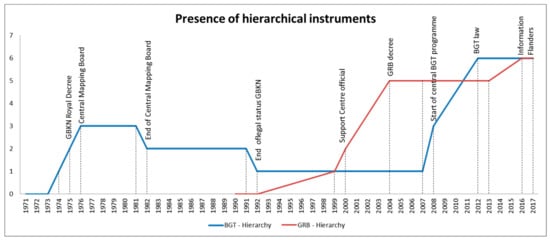 Presence of hierarchical instruments in the SDI cases: 1971–2017 BGT (The Netherlands) and 1990–2017 GRB (Flanders). Labels are in reference to key moments in the development of the specific large-scale base map.