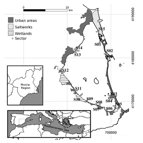 The Mar Menor is a hypersaline coastal lagoon located in southeastern Spain (Figure 1). With a surface of 135 km2 and an average depth of 4 m [47], it is the largest coastal lagoon of the western Mediterranean. It is surrounded by ca. 600 km2 of irrigated agricultural plain inside a total watershed area of 1275 km2 [48] with dense touristic urban developments, and it is almost enclosed from the Mediterranean Sea by a sand bar, also dominated by urban development. Since 1994, the Mar Menor is also designated as a Ramsar Site and since 2001 as a Bird SPA and a Specially Protected Area of Mediterranean Importance. The coastline is fringed by patches of saltmarsh and salt steppes and a former salt works that was abandoned during the 20th century, interspersed with agricultural (traditional or intensive) and urban areas.