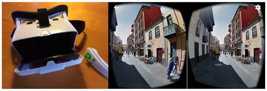 To represent the proposed 2D urban route, the Google Maps free application was used. The 3D urban immersive environment was displayed using the Google Street View free application installed in the smartphones of the participants. The smartphone was integrated in virtual reality 3D glasses (15 Woxter Neo VR 3D glasses equipped with 15 joysticks), and the student moved around the environment (exploratory navigation) via the joystick with Bluetooth connection for remote control. Participants performed the activity with their own smartphones.