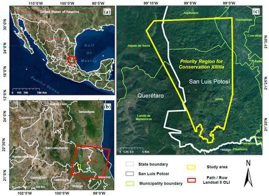 Study area. (a) Location of study area; (b) Landsat 8 Operational Land Imager (OLI) sensor scene—path/row: 026/045, taken during 2 January 2016; (c) border of Priority Region for Conservation Xilitla at the municipalities involved.