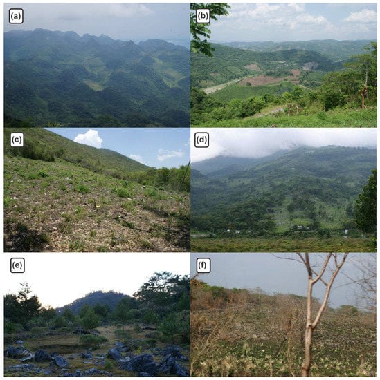 Six sites in the study area. (a) Location name: La Herradura (21°25′55.75″ N, 99°02′42.83″ W), description: shifting cultivation as a land use change driver in the Priority Region for Conservation Xilitla (Mexico); (b) Location name: Las Joyas, Xilitla (21°26′03.49″ N, 99°02′49.62″ W), description: hilly terrain and land use change; (c) Location name: Near to Ollita del Pino, Xilitla (21°22′53.09″ N, 99°03′13.8″ W), description: land deforested by shifting cultivation; (d) Location name: Near to Rancho Nuevo, Xilitla (21°26′20.89″ N, 99°02′25.41″ W), description: hilly terrain and land use change; (e) Location name: La Trinidad, Xilitla (21°24′13″ N, 99°04′21″ W), description: land for pasture in hilly terrain; (f) Location name: Near to Tangojo (21°30′26.51″ N, 99°04′39.1″ W), description: land use change by shifting cultivation.