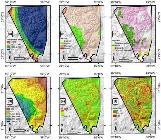 Variables used for determining the soil-loss-related factors employed in the USLE equation. (a) Mean annual precipitation for estimating the R factor; (b) Soil type for assigning a K Factor; (c) land use/land cover map to create the training fields for supervised classification and assigning the C factor; (d) digital elevation model for calculating the (e) LS factor and (f) the terrain slope.