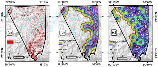 Variables used in the MCDA approach for estimating the feasibility to restore. (a) Bare soil map obtained by supervised classification of Landsat 8 OLI spectral data; (b) Distance to road; (c) Distance to town.