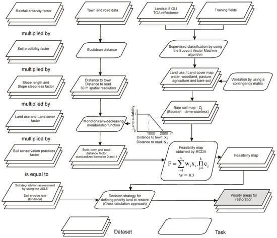 This research was carried out in three phases. Firstly, we used the Universal Soil Loss Equation to estimate soil erosion rate as a proxy of an urgency measure for restoration. Secondly, the Multi-Criteria Decision Analysis was applied for identifying those bare soil locations and determining its feasibility to be restored considering proximity factors. And therefore, we combined both USLE and MCDA outcomes by using a cross-tabulation matrix to identify priority land for being restored.