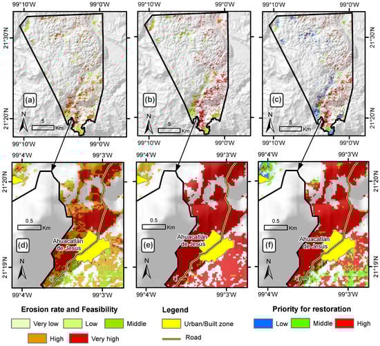 Degraded land in the Priority Region for Conservation Xilitla. (a) soil erosion rate by USLE, (b) feasible land to restore according distance to town/road by applying MCDA, (c) priority areas for restoration integrating USLE and MCDA; (d–f) are a zoom-in to a detailed location into the study area.