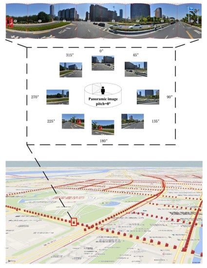 The normal human visual field is defined as the spatial range observed by a single eye or both eyes from a fixed point of view. The boundaries of the normal human visual field are 56° upwards, 74° downwards, 65° nasally (towards the nose), and 91° temporally (away from the nose). The horizontal and vertical field of view (FOV) of cameras typically used to capture street view images ranges from 80 to 140°; when the pitch angle of the street view camera is 0°, its visual field is approximately equal to that of the normal human visual field. We sampled points at 30-m intervals according to the sampling points indicated in Figure 2 and obtained a total of 1669 sampling points. We downloaded a total of eight images (each with a pitch angle of 0° and headings of 0°, 45°, 90°, 135°, 180°, 225°, 270°, and 315°) to form panoramic images that simulate the 360° view that surrounds a person standing at a fixed point, as shown in Figure 2. All of the street view images taken in the study area were acquired during October 2014.