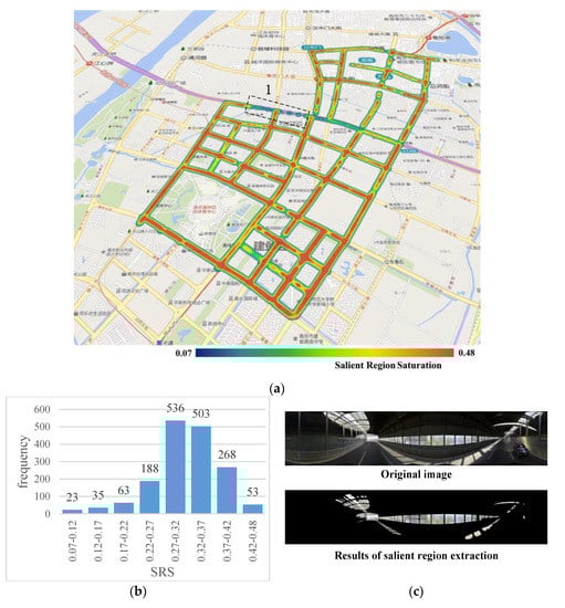 Figure 3a shows the results of the SRS calculation of 1669 panoramic images in the study area. In Figure 3b, which shows the SRS histogram comprised of all panoramic images, it is clear that most of the sampled points have SRS values in the range 0.27–0.42, with only a few points having values outside of this range. The SRS distribution map of the study area shown in Figure 3a indicates that most of the streets in the study area have a high SRS level, indicating that these streets are visually full and brightly colored on the whole, and thus easily attract the attention of pedestrians. We noticed a low SRS level for Street 1 in Figure 3a. This is because Street 1 is dome-roofed elevated road, as shown in Figure 3c, in which we observe that the regions recognized as salient regions include portions of the sky of which the colors are not saturated, potentially causing people to feel depressed and uncomfortable.