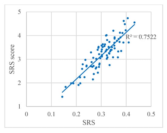 Relation between SRS and the SRS score from the questionnaire. Each dot represents a panoramic image.