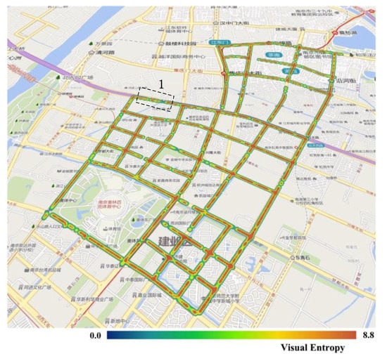 The VE of all panoramic images in the experimental area is shown in Figure 5. The results in the figure indicate that, although the visual entropy has a range of (0, 8.8), most of the streets in the study area have high levels of visual entropy, with these levels being relatively homogeneous throughout. As a whole, this indicates that the urban streetscapes within the study area are richly layered. A more detailed inspection reveals that Street 1 (Figure 5) has a lower-than-average level of visual entropy. This is because this road is an elevated road with a domed roof, as described by the analysis in Section 4.1. As shown in Figure 3c, much of the visual field is blocked by the domed roof, which results in only a few visual layers and a correspondingly low value of visual entropy.