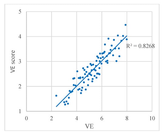 Relation between VE and the VE score from the questionnaire. Each dot represents a panoramic image.