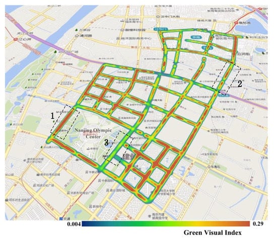 Figure 7 shows the results of the calculation of the GVI of 1669 panoramic images in the experimental area. The figure shows that, in terms of the overall distribution of the GVI within the study area, the GVI of the streets located in the southern part was higher than that of the streets in the northern part. These results are consistent with the fact that residential areas and a science and technology park are located in the northern part of the study area, whereas the southern part comprises the new town, the Nanjing Olympic Center, and its surrounding areas. It may also be observed from this figure that the western and southern sides of the Olympic Center have a higher GVI than the northern and eastern sides. The specific states of green regions along these streets are shown in Figure 8. Street 1 had the highest GVI and Street 2 had a moderate GVI, whereas Street 3 had the lowest GVI. Street 1 is a section of Leshan Road west of the Olympic Center, and one may observe that the panoramic image is almost entirely covered by trees, shrubs, and grassy areas. Street 2, which is a section of Nanhu road with many residential suburbs in its surroundings, has a moderate level of greenery. Street 3 is a section of Central Jiangdong road to the east of the Olympic Center. This street is an expressway that was opened for use fairly recently, and the trees on the sides of this road are still relatively young; hence, this road has the lowest level of greenery among these three streets. In general, streets with higher GVI such as Street 1 are likely to enhance the vivifying and refreshing visual perception, rather than Streets 2 and 3.