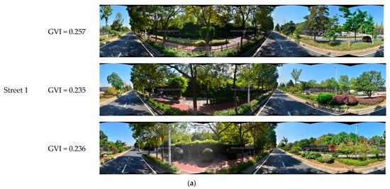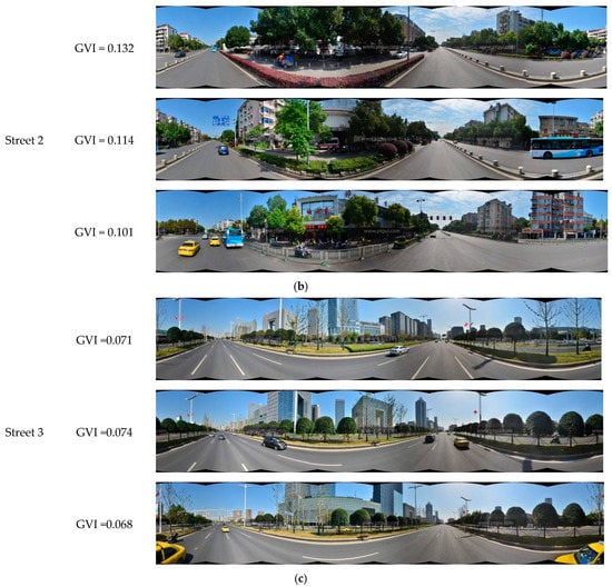 Streets with different GVI levels. (a) Street 1; (b) Street 2; (c) Street 3.