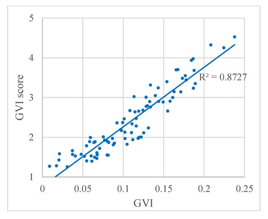 In addition, Figure 9 shows the relationship between the GVI and the GVI score from the questionnaire. We found a strong correlation between the two scores with a correlation coefficient of R2 = 0.8727. These results indicate that the GVI calculated based on the proposed automatic classification method is of high quality, and the GVI values are in accord with the visual perception. Although the GVI performs well, this index cannot differentiate among pixels that appear green because of vegetation and other green pixels, such as green signs and buildings. This problem may be solved by adding multi-temporal data in future studies. Multi-temporal images could show the different vegetation colors during different seasons to identify the vegetation, and further improve the correlation coefficient.