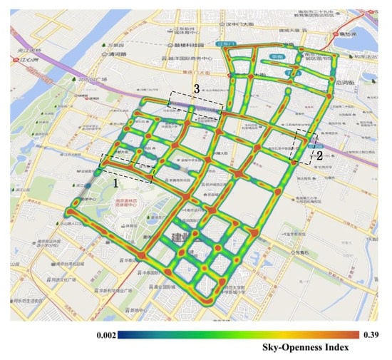 The sky-openness index (SOI) results in the study area. The streets outlined by the black dotted lines are denoted Street 1, Street 2, and Street 3, respectively, and the SOI from high to low is: Street 1, Street 2, and Street 3.