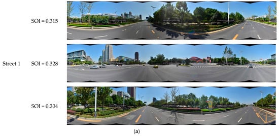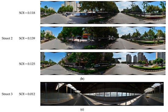Streets with different SOI levels. (a) Street 1; (b) Street 2; (c) Street 3.