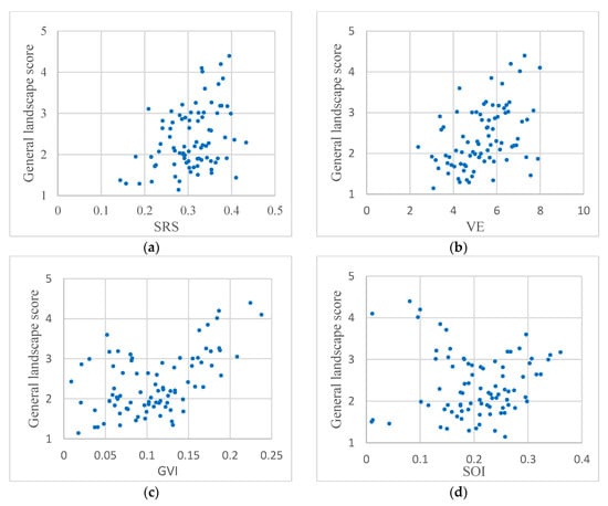Relation between the general landscape score and the four respective indices: (a) SRS; (b) VE; (c) GVI; (d) SOI.