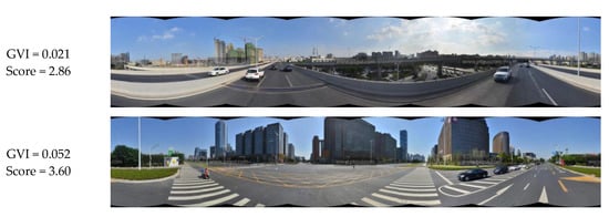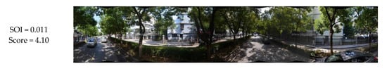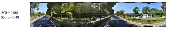 In this study, four indices, namely, SRS, VE, GVI, and SOI were employed to effectively reflect visual perception. This suggests that there may be some relationships between these indices and the general landscape. The relationships between the four indices and the general landscape score from the questionnaire are plotted in Figure 13. Figure 13a,b indicate that the SRS and VE have a positive correlation with the general landscape score, although it is not particularly strong. This indicates that additional SRS and VE would be expected to result in a more pleasing landscape. Further, in Figure 13c,d, a fairly interesting observation is that the overall score shows a “V” distribution with an increase in GVI and SOI. This means that some points have a low GVI or SOI but a high score. In the case of Figure 13c, this is because some streets do not contain much green vegetation but are characterized by beautiful sky, buildings, and billboards. As shown in Figure 14, panoramic images have broad sections of sky and tall buildings, which create princely visual perception, thus the score from the questionnaire is relatively high. For Figure 13d, as shown in Figure 15, some streets are lined by many trees, which obstruct the sky and result in a low SOI. However, the proliferation of trees can form a landscape of vegetation and hence the best visual perception and result in a high score. Therefore, ways in which to combine the GVI and SOI, or allocate weights to them should be considered carefully under different requirements for visual perception.