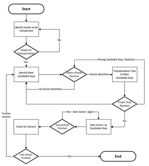 Proper Stop Reached (Decision): Once the transportation task finishes it has to be validated that the right candidate stop is reached and the planned action (i.e., manufacturing process) can be performed. In any other case, there is a fall back to either the identification of a “new” next candidate stop or a “new” route decision.