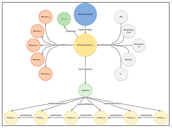 In order to store manufacturing data in the graph database, the authors extend the data model introduced by the ontology by [10]. In the remainder of this article, the ontology developed by [10] is denoted as IndoorOntology::Production. This data model comprises historical information and attributive data, which are stored as a trajectory of the production asset, together with data on the next processing steps. Based on this, Schabus, S., et al. [53] developed a spatially linked manufacturing data approach with the production asset as the main entity in the manufacturing environment. Therefore, the manufacturing environment involves historical information—like the trajectory and the performed production steps—and the future manufacturing steps. The production asset links the trajectory, equipment, and sensor data of processes along a production chain with the future production steps (i.e., the so-called operations “aligned” on a route) and suitable equipment for each operation [53].