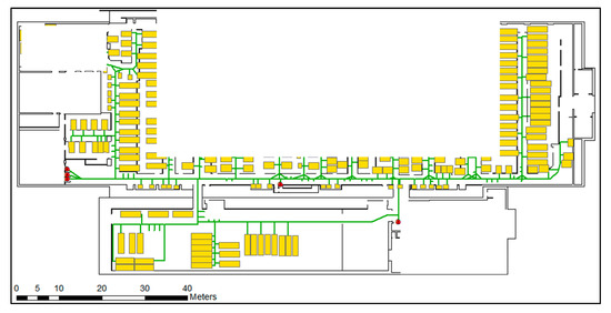 Figure 4. An indoor space layout of the manufacturing environment. Yellow rectangles represent devices in the clean room, and red dots represent transfer nodes. The green lines represent the traversable indoor network. The white spaces intentionally disguise the complete production layout (adapted from [10]).