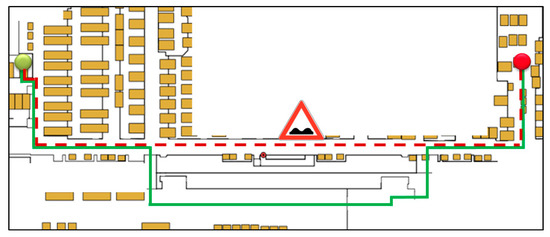 Figure 5. Visualization of the task “Make Route Decision” resulting in two visualized candidate routes and the highlighted optimal route of these two candidate routes. The smart transportation task starts at the green point on the left side and goes to the red point on the right side. The two possible candidate routes are identified as green and red lines. For this specific route decision, concussions affecting one candidate route—visualized in red—are detected by sensors or personal observations by human operators. Therefore, the optimal route is the solid green line, which is longer than the red one, but not optimal in terms of quality assurance.