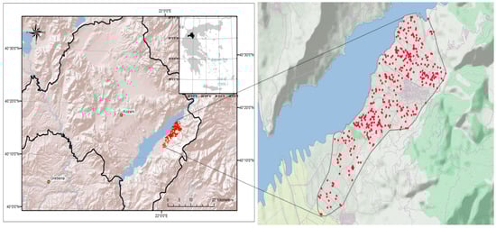 A soil survey was conducted in the regional unit of Kozani in northern Greece. The specific area is located next to Polifitou Lake (Figure 1) at an altitude of approximately 400 m above sea level (from 300 m in areas close to the lake to 500 m) and covers an area of approximately 28 km2.