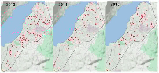 During this soil survey, 400 field parcels were randomly sampled from 2013 to 2015 so that different parts of the cultivated area would be covered. Specifically, 177, 109, and 114 soil samples were taken in 2013, 2014, and 2015, respectively, accounting for 400 samples for all three years (Figure 2). Global Positioning System (GPS) receivers were used to identify the sampling positions. Soil sampling took place during the period from autumn to winter for the three consecutive years.