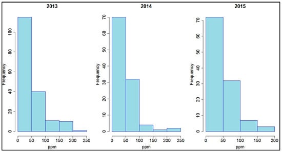 The frequency distributions for Fe for each year were right-skewed, as seen in the following histograms (Figure 3).