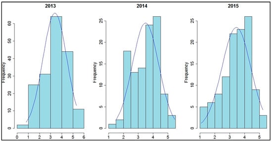 The frequency distributions of pH per year were more symmetrical than those of soil Fe, as seen in the following histogram (Figure 5).