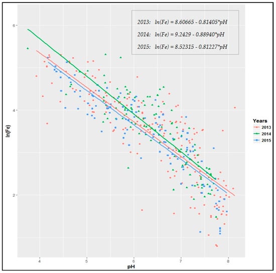 Table 2 showed that the fitted linear regression models explained 68%, 70%, and 78% of the variability of ln(Fe) for 2013, 2014, and 2015, respectively, and exhibited quite similar behaviour, having similar regression lines and functions each year, as presented in Figure 6.