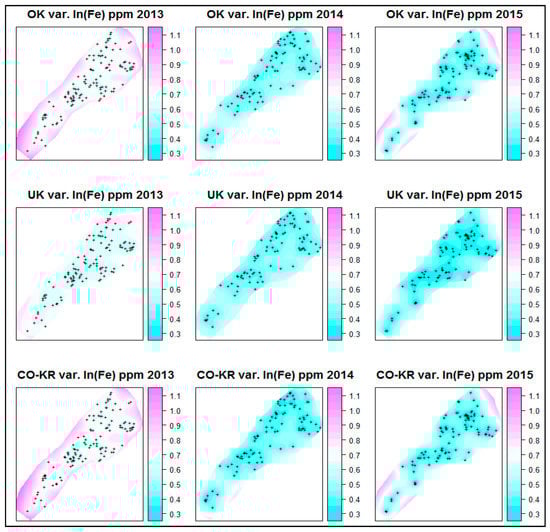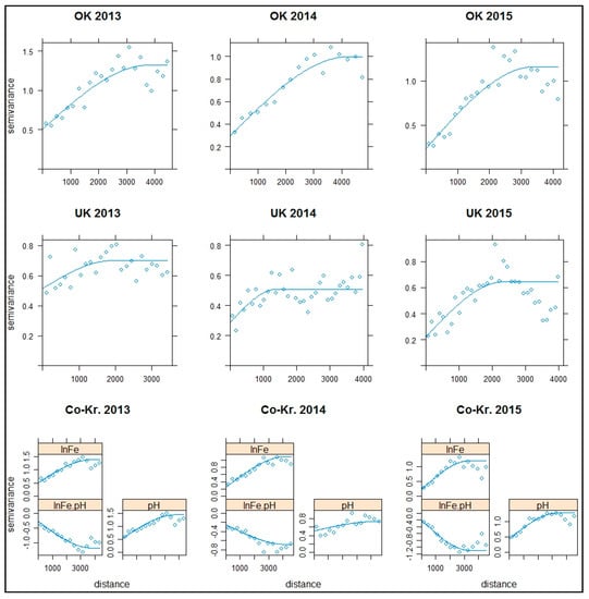 Based on the close values in the ranges between OK ln(Fe) and pH for each year, the same range of OK ln(Fe) values was also used for Co-Kriging (each year) as a stable parameter from the semivariogram to the cross-semivariogram (3795 m for 2013, 4251 m for 2014, 3396 m for 2015). The spatial dependence could be characterized as strong to moderate (from 18% to 33%).