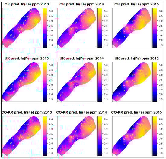 The OK for pH had high ranges similar to the OK for ln(Fe), ranging from 3148 to 4300 m. The other semivariogram parameters were also mostly similar. For 2013, all the parameters were very close (C0 OK: Fe = 0.51, pH = 0.58, C1 OK: Fe = 0.82, pH = 0.74, range OK: Fe = 3795 m, pH = 3458 m); for 2014, there was a difference in sill (C0 OK: Fe = 0.30, pH = 0.36, C1 OK: Fe = 0.70, pH = 0.46, range OK: Fe = 4251 m, pH = 4303 m); and, for 2015, there was a nugget deviation (C0 OK: Fe = 0.23, pH = 0.41, C1 OK: Fe = 0.94, pH = 0.85, range OK: Fe = 3397 m, pH = 3148 m). However, the overall similar semivariogram parameters supported that these co-variables exhibited a spatial relationship (in addition to the strong value correlation presented in the regression analysis) that might increase the prediction accuracy in Co-Kriging. The spatial dependence of pH for OK was rather moderate, from 32% to 43%.