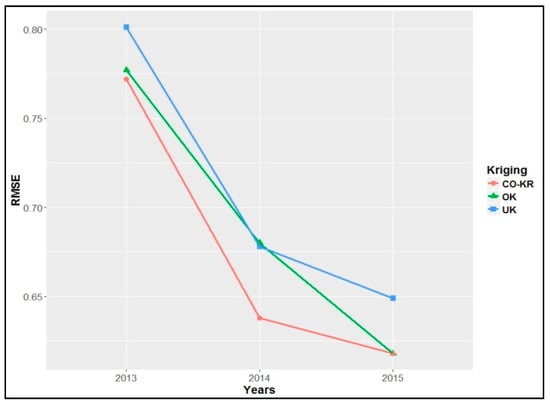 Initially, the ‘holdout cross-validation’ method results are presented. In this case, the models that were already estimated from the training set (Table 3) were used for predictions in the test set. As shown in Table 4, the prediction errors (RMSE) of soil iron using Co-Kriging were slightly lower than those of the other interpolation methods for every year, except for those of OK for 2015, which were equal (Figure 10). Also, the year 2015 had the lowest prediction errors overall.
