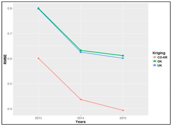 This method had overall similar results with the holdout method regarding prediction errors (RMSE); however, it presented a clear improvement against the Co-Kriging interpolation method in comparison with the other interpolation methods, with an approximately 25%, 30%, and 35% decrease for each year (Figure 11).