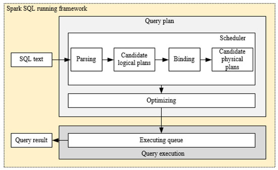 Spark SQL is a widely used component of Spark for processing the structured data. Spark SQL’s predecessor is Shark, and it tries to provide a quick start tool for the technical staff who are familiar with RDBMS and are not particularly skilled in MapReduce. In fact, there are some early SQL-on-Hadoop tools running on Hadoop, such as Drill, Impala and Shark [29,30,31]. However, the large numbers of intermediate disk I/O operations in the MapReduce process are the major bottleneck of the query tasks, and the limited performance of disks reduces the query efficiency. In order to achieve higher efficiency, the SQL-on-Spark tool began to emerge, and Spark SQL was born under this context. Similar to the relational database, the SQL query statement in Spark SQL is also mainly composed of projection (e.g., a1, a2, a3), data source (e.g., tableA), and filter (i.e., conditions) [32]. The running framework of Spark SQL is shown in Figure 1. After the SQL query is interpreted, a series of candidate physical plans are generated through binding data and calculation resources. Then, an optimization process is performed to choose an optimal plan put into the executing queue. Lastly, the query result would be returned after the execution step.