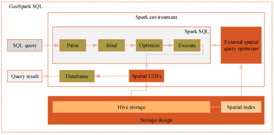 Therefore, we can take full advantage of Spark SQL to achieve our spatial query processing framework, i.e., GeoSpark SQL. However, Spark SQL cannot be used directly for spatial queries, several problems should be addressed through extending Spark SQL. First, because Spark including Spark SQL is only a memory-computing framework, there is a need to design an appropriate spatial data external storage method as well as the spatial index. Secondly, Spark SQL does not support spatial functions or operations, so it is necessary to extend spatial operators in the Spark environment to meet the spatial query requirement. Finally, besides the internal query optimizer provided by Spark SQL, an external spatial query optimizer could be designed to achieve plan optimization for spatial queries to improve performance. Figure 2 illustrates the architecture of GeoSpark SQL.